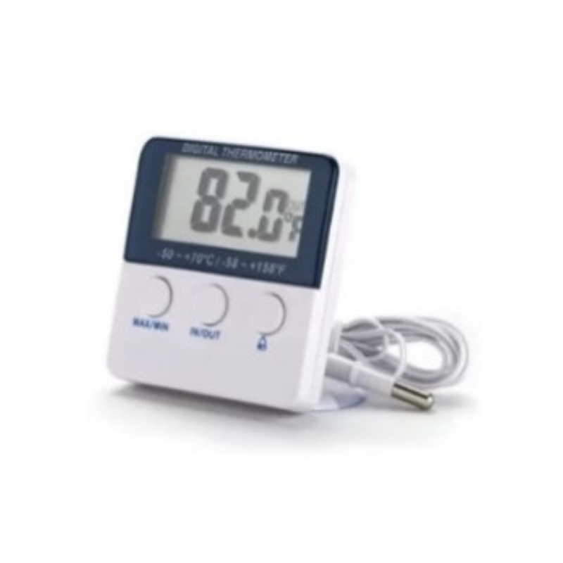 Termómetro digital compacto con sonda externa ideal para el monitoreo de temperatura en refrigeradores, congeladores o cámaras frías.
